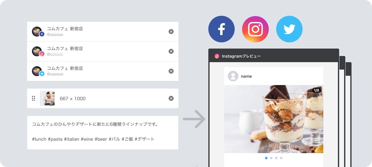 店舗運営で利用頻度の高いInstagram、Facebook、Twitterの各SNSアカウントと連携させることで、複数SNS×複数アカウントへの一括投稿が可能に。さらに、Instagramに投稿するだけでGoogleマップ(Googleビジネスプロフィール)に自動投稿できる機能も追加いたしました。