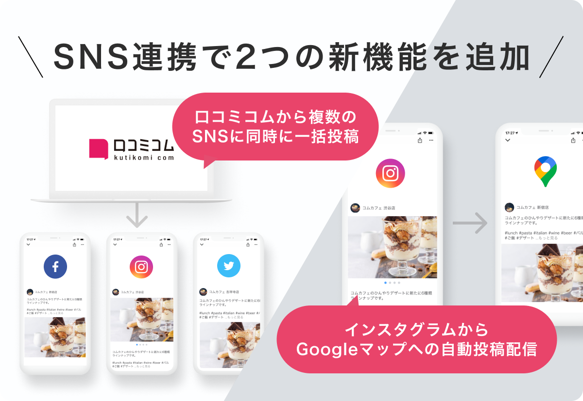 今回、「SNSの管理も口コミコムでできるようにしたい」「各種SNSへの投稿にかかっている時間を減らしたい」といったお客様の希望にお答えして、複数SNS・Googleマップ投稿がもっと便利になる機能を追加いたしました。