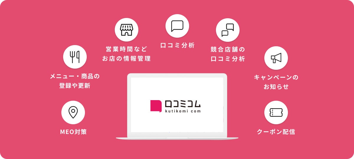 口コミコムは、Googleマップをはじめとした地図アプリや口コミサイトでの店舗情報を整理し一括更新できると同時に、お客様の口コミ分析、クーポンの配信まで行うことで、国内外の口コミサイトを”もっと”売上に変える「口コミサイトの一括管理ツール」です。
