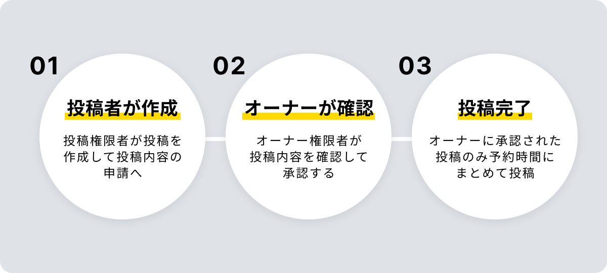 投稿を作成・公開できる「オーナー」と、作成のみで公開はできない「運用者・編集者」に権限を分けることができ、オーナー権限者が承認するまでは勝手に投稿されることはありません。