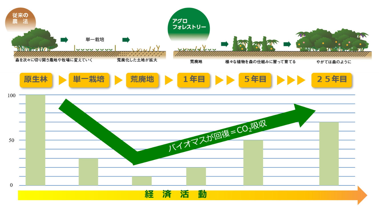 下図は原生林を伐採した後に単一栽培を行い、アグロフォレストリー農法を行った際のバイオマス量※の変化をイメージしたものです。伐採によりバイオマス量が急減し、単一栽培によって土壌養分が枯渇し荒廃地化しますが、アグロフォレストリーに変換後は樹木の成長と共にCO2を吸収・固定していきます。農業という経済活動を行いながら森林を回復させる希少なモデルです。