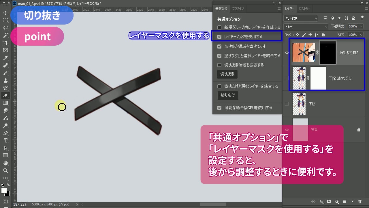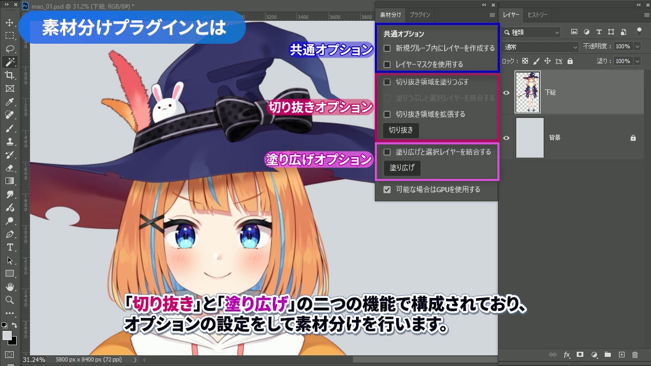 「切り抜き」と「塗り広げ」の二つの機能で機能で構成されており、オプションの設定をして素材分けを行います。