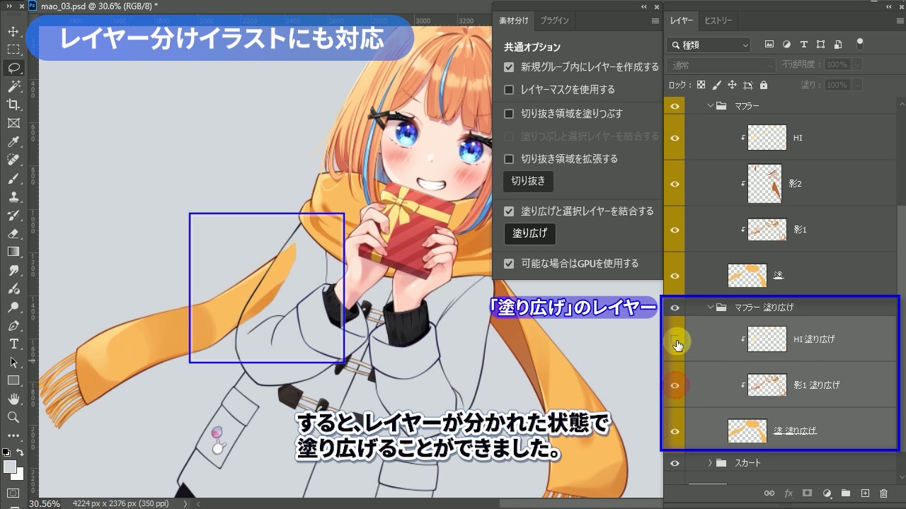 例ではレイヤーが分かれているキャラクターのマフラーを選択範囲で指定し塗り広げを行っています。