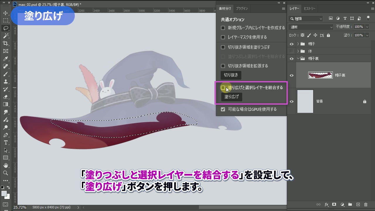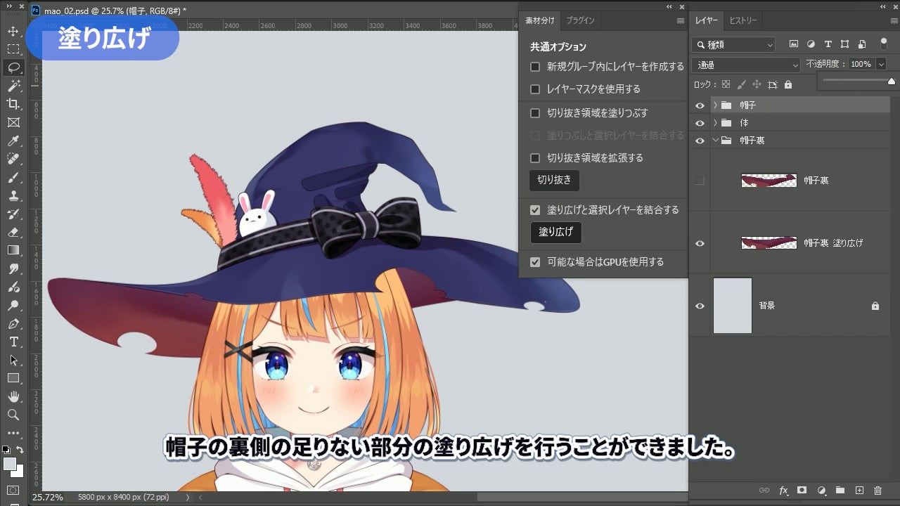 例ではキャラクターの帽子のつばの裏側を選択範囲で指定し塗り広げを行っています。