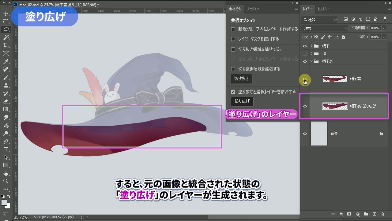 正式版で追加された「塗りつぶしと選択レイヤーを結合する」をオプションで設定することで、元の画像と統合された状態の「塗りつぶし」のレイヤーと「切り抜き」のレイヤーが生成されます。