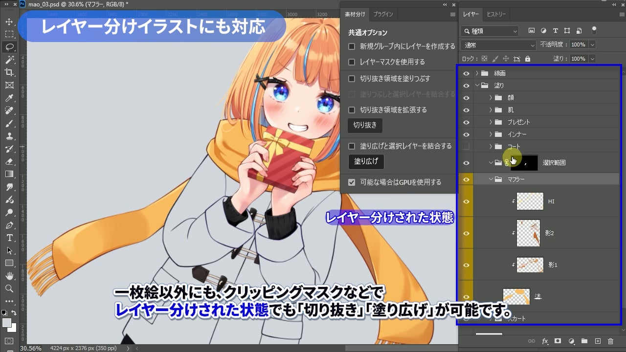 「切り抜き」と「塗り広げ」は一枚絵以外にも、クリッピングマスクなどでレイヤー分けされたイラストに対応しています。