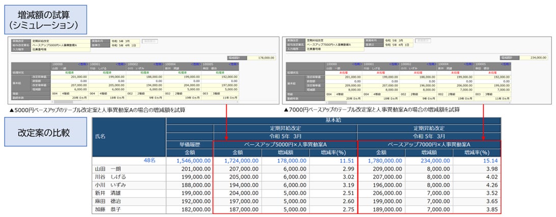 テーブルの改定案と指定日時点の社員情報を利用して、簡単に昇給・賞与額を試算できます。人事異動案を使用した試算にも対応するため、人事異動による昇給をシミュレーションできます。