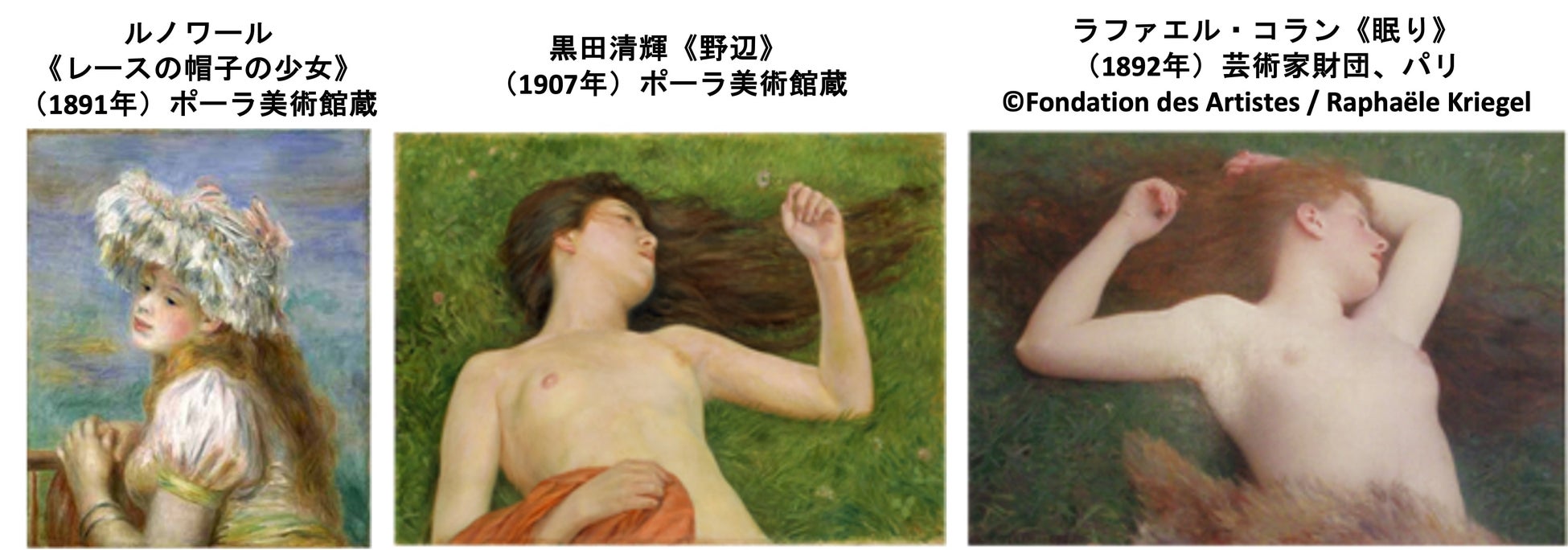 次に、同時代の画家が蛍光発光を意図的に使用しているかを調べました。ルノワール《レースの帽子の少女》(1891年)、フジタの師にあたる黒田清輝《野辺》(1907年)、黒田の師にあたるラファエル・コラン《眠り》(1892年)、を調べ、師からの技術的な継承があるかどうかも含めて調査しました【図5】。