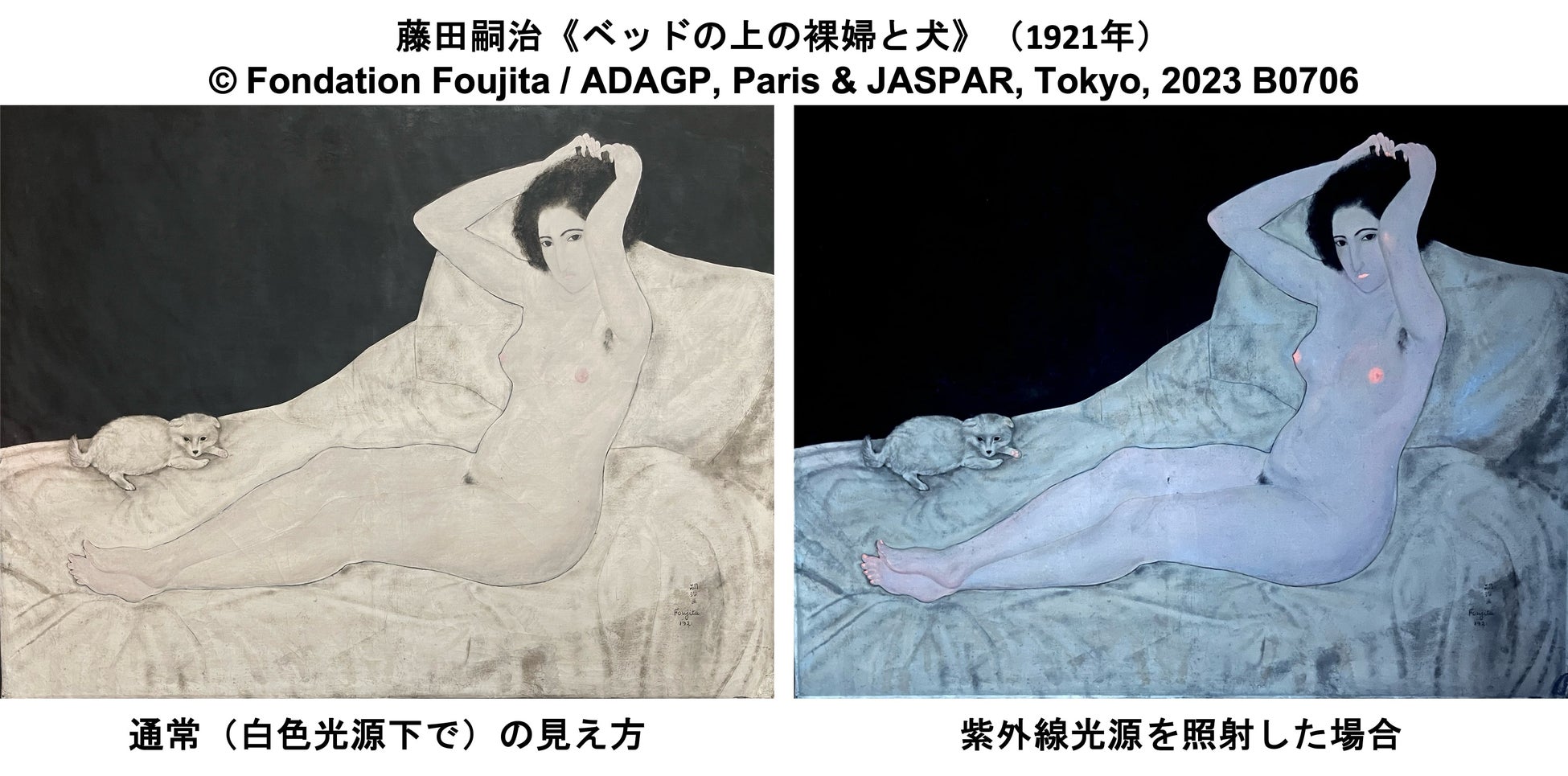しかしながら、フジタのほとんどの作品は修復されており、また戦後の美術館は劣化しないように、紫外線をカットしているため、フジタが顔料を使い分けていた意図が伝わらなくなっていた可能性は高いといえます。1920年代当時、「グラン・フォン・ブラン(素晴らしき白)」と称されたフジタの絵画が、修復と鑑賞環境の変化により、全く違ったイメージになっていたとしたらどうでしょうか?今回の発見はその事実を示唆するものです。