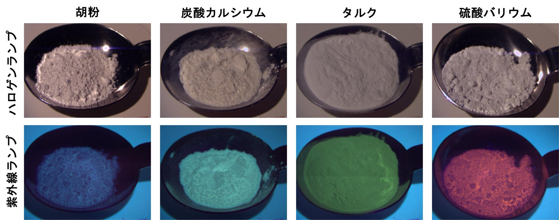 今回、2011年の組成分析によって報告されたフジタが使用していた白い顔料である、炭酸カルシウム、タルク、硫酸バリウムの蛍光成分を調査しました。その結果、炭酸カルシウムは青緑、タルクは緑、硫酸バリウムは赤の蛍光発光が見られました。実際に、紫外線を当てた《ベッドの上の裸婦と犬》の肌の色には青い蛍光発光が見られますが、炭酸カルシウムがいったい何の顔料であるかはわかっていません。そこで、同じく炭酸カルシウムを主成分とする胡粉の蛍光成分を調査したところ、青い蛍光発光が見られました【図2】。