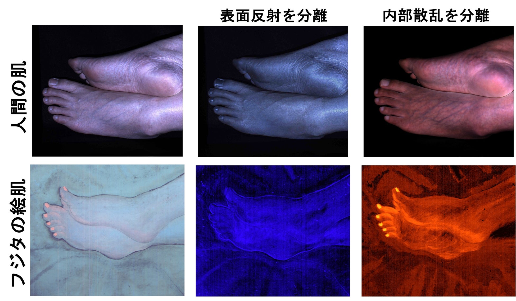 さらに、フジタが実際の人間の肌の構造的、光学的な再現を意図していたと考え、足部分に関して人の肌の持つ光学特性である肌表面反射と肌内部散乱成分を観測する技術を使用し、絵画から抽出された成分と比較しました【図4】。その結果、波長の違いによる肌内部への透過具合の違い(赤い波長の方が透過する)にも起因して、肌表面の光は、硬い印象があり、肌内部の光は赤みを帯びていて柔らかい印象があることがわかりました。それらは、フジタの絵画において赤成分が膨らみのある箇所に使われていることと似ており、フジタが実際の肌に近い光学特性を再現していたと考察することができます。