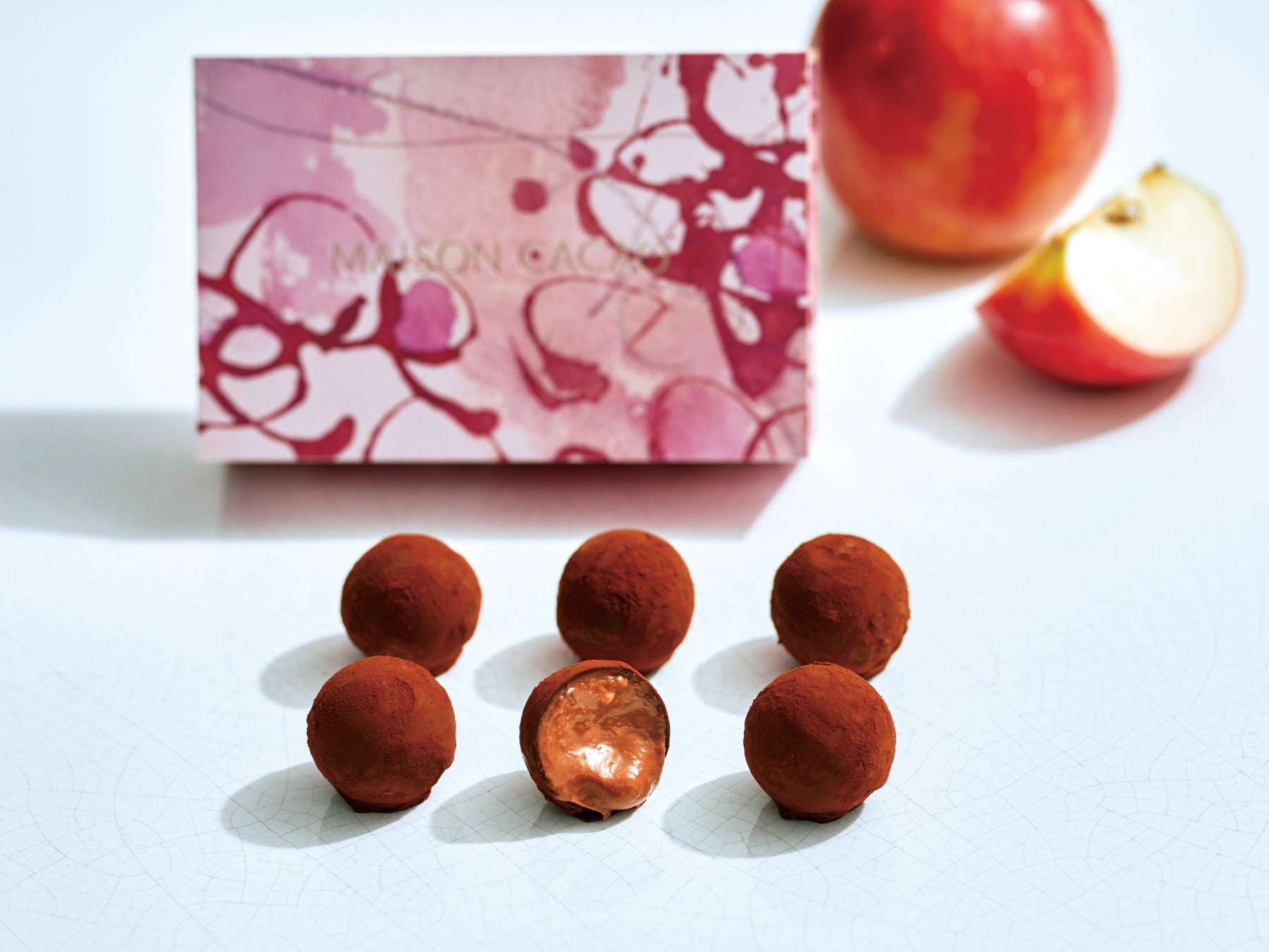 「旅するメゾン」で出会った、青森の平山農園のみずみずしいりんごを使用しました。合わせるのはりんごの甘みと酸味を引き出す、コロンビア産のフルーティーなミルクチョコレートです。コーティングは味わいを引き締める、ビターチョコレートを薄く纏わせています。バレンタイン時期は名古屋タカシマヤのアムールデュショコラ 限定です。