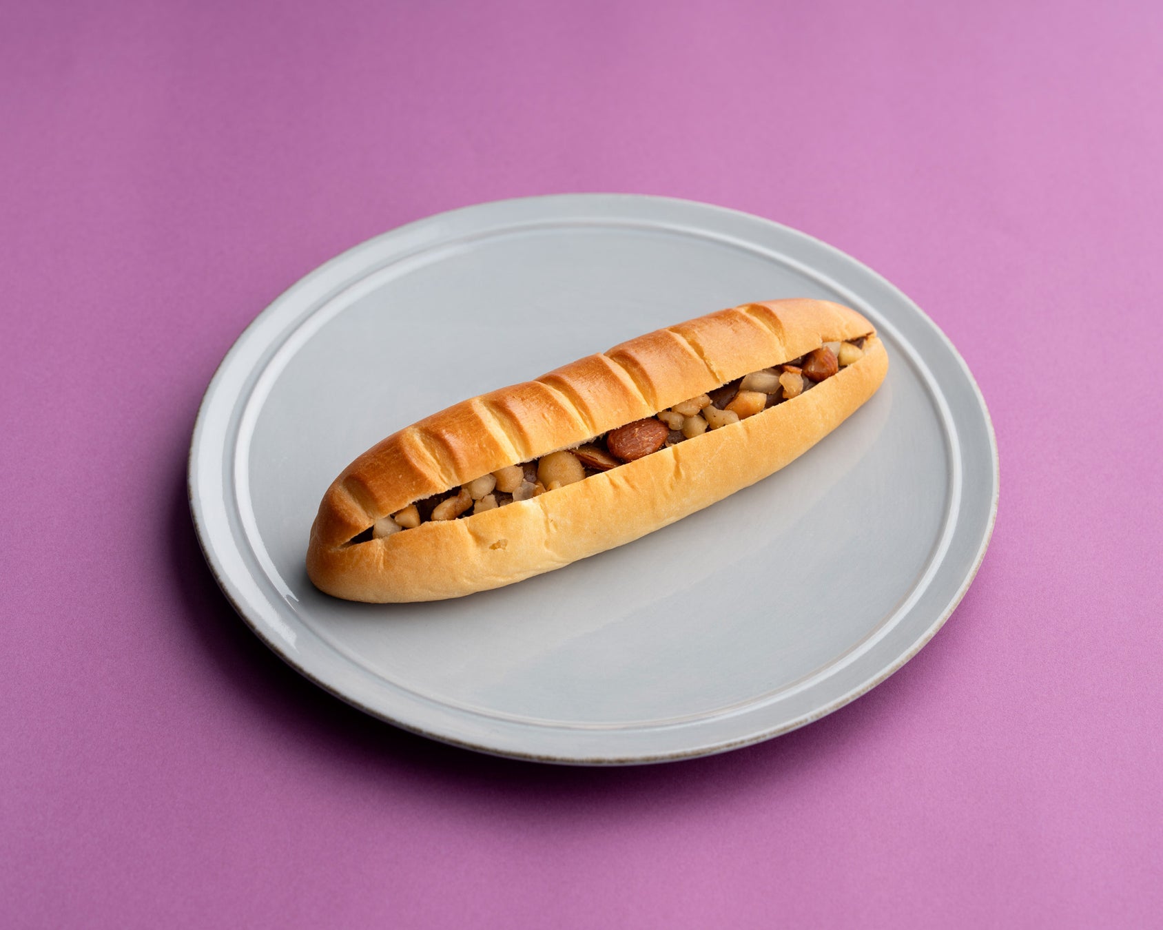 ヴィエノワとは「ウィーン風のパン」という意味で、切り込みが入った長い棒状のパンです。店内で焼き上げたブリオッシュ生地の間に、カカオ分58%のクーベルチュールチョコレートを用いた自家製チョコカスタードを絞り、燻製ナッツの香ばしさを合わせた一品。アーモンド・カシューナッツ・クルミ・マカダミアナッツの4種類のナッツを使用。あえて燻製ナッツを用いることで、香ばしい風味がより際立ち、チョコカスタードの味わいを一層引き立てています。パンはあえて細長く成形し、一口ごとにチョコカスタードと燻製ナッツの組み合わせを楽しめるように仕上げました。
