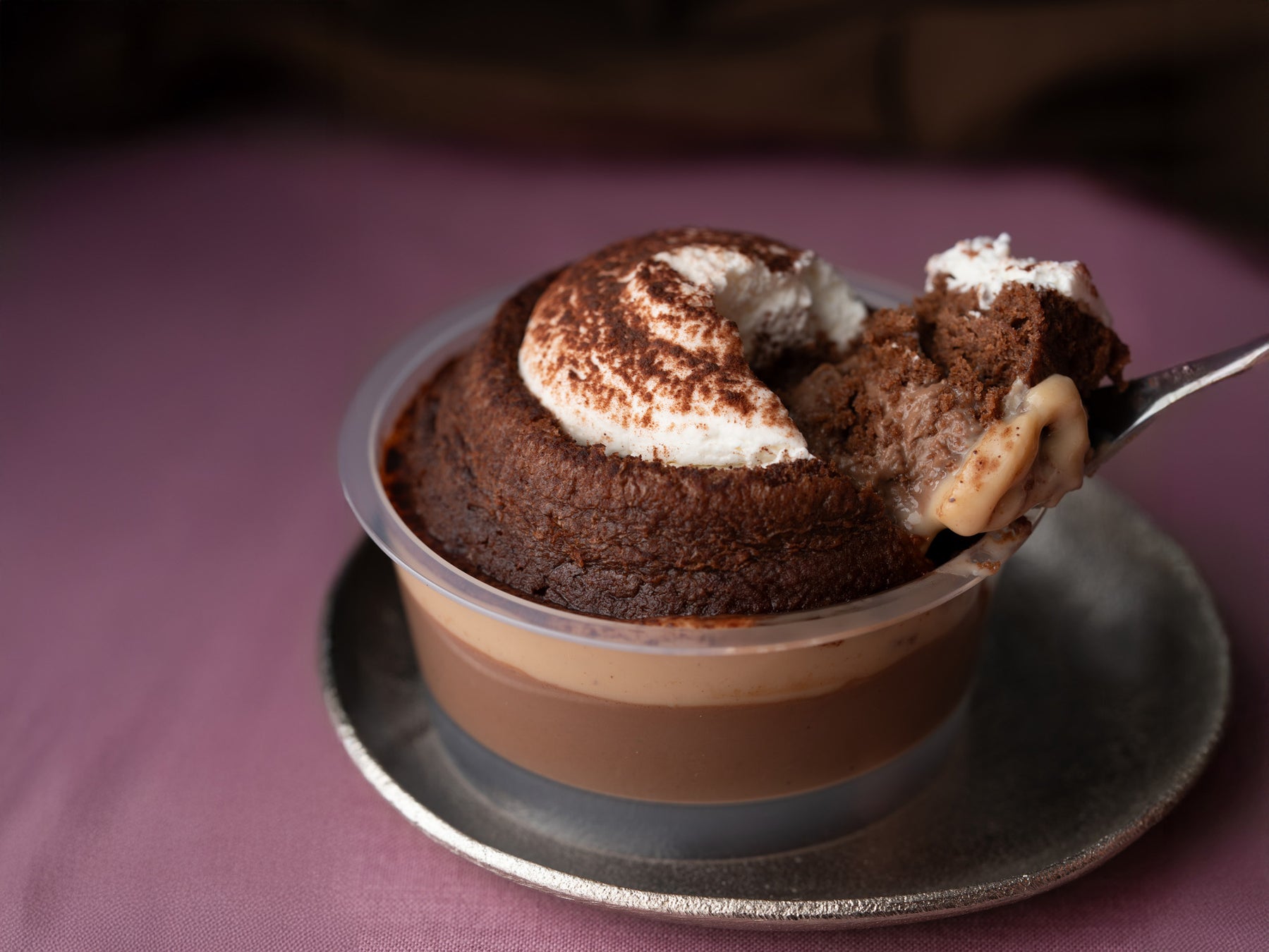 卵黄と生クリームを用いてなめらかな食感に仕上げたショコラプリンの上にガトーショコラをのせた、2層仕立てのデザートです。口の中で2層が一体感のある味わいとなるように、ガトーショコラは窯の中で湯煎焼きをして口どけの良い食感に仕上げました。上からホイップした純生クリームをのせ、さらに食感と風味のアクセントにマロンペースト入りのソースをかけています。ショコラプリンとガトーショコラはどちらもカカオ分66%のクーベルチュールチョコレートを使用しているため、華やかでフルーティーなカカオの風味を存分にお楽しみいただくことができる一品です。