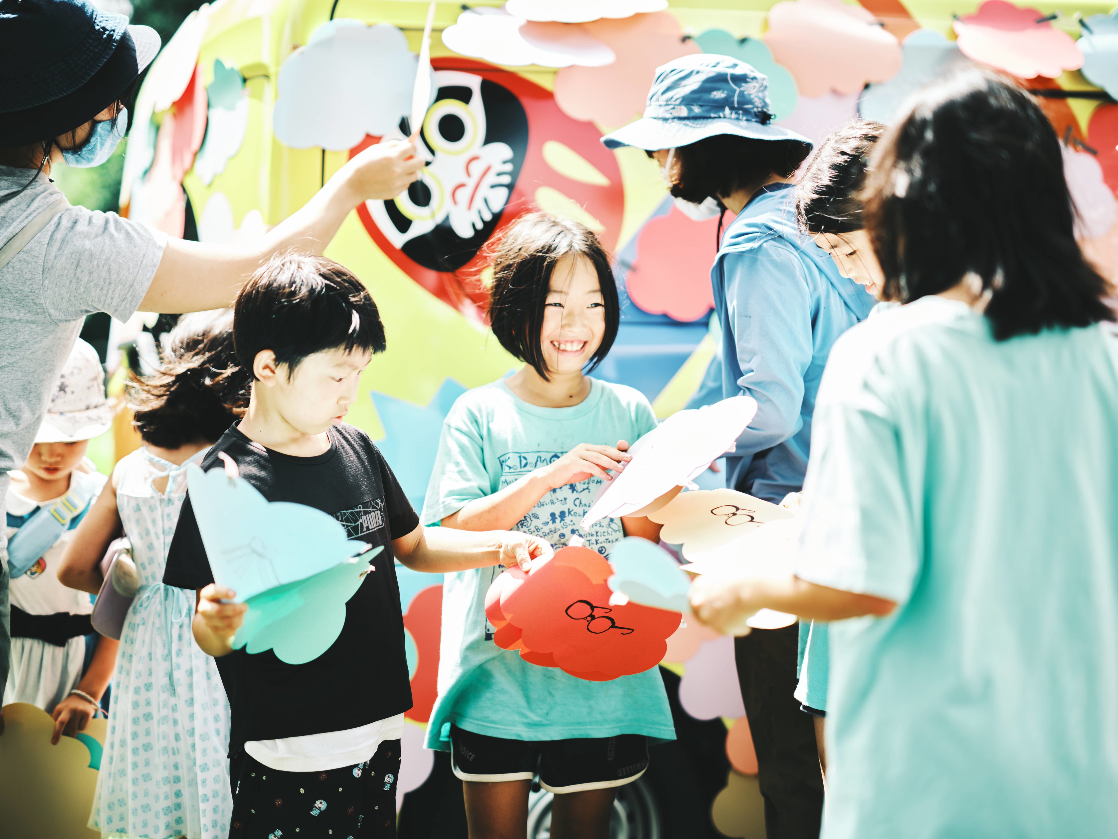 本日のお披露目には、「プレーパークせたがや」スタッフと地域の親子総勢35名が参加。車体が幾枚もの紙で覆われどのようなデザインなのか見えない状態からスタートし、子どもたち自身の手によって紙が剥がされていくことで、車体の全貌が明らかに。新しいプレーカーとの対面に子どもたちから歓声があがりました。