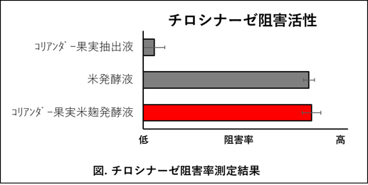 まず、シミの原因であるメラニン産生過程に必要な酵素チロシナーゼの阻害効果を測定しました。その結果、未発酵のコリアンダー果実抽出液※よりもチロシナーゼ阻害効果が著しく増加していました。また、美白の有効成分として有名な「コウジ酸」を含む米発酵液※と同様に高い阻害効果を示していました。実際、コリアンダー果実米麹発酵液にコウジ酸が多く含まれていることも確認しています。つまり、コリアンダー果実米麹発酵液はシミを抑制する効果を持つことが期待できます。