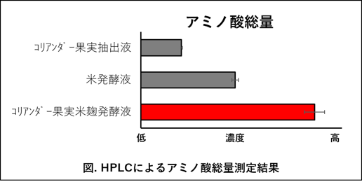 その結果、コリアンダー果実抽出液及び米発酵液よりも豊富なアミノ酸を含有していることが解明されました。これは、麹菌によってコリアンダー果実のタンパク質分解が進んだことで相乗的にアミノ酸含有量が増えたものと考えられます。つまり、コリアンダー果実米麹発酵液は発酵することによって、より高い保湿効果を持つ可能性が示されました。