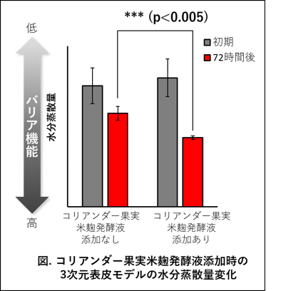 また、表皮ケラチノサイトにおいて肌のバリア機能に関連する複数の遺伝子が、コリアンダー果実米麹発酵液の添加によって発現増加することが分かりました。そこで肌のバリア機能との関与をさらに調べるため、3次元表皮モデルの水分蒸散量を測定しました。その結果、コリアンダー果実米麹発酵液の添加72時間後に水分蒸散量が優位に減少していました。水分蒸散量が低い肌はバリア機能が高いことが報告されています。つまり、コリアンダー果実米麹発酵液が肌のバリア機能を高める可能性が示されました。