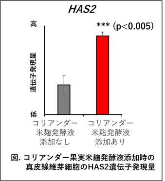 さらなる有用性を探索するため、皮膚細胞にコリアンダー果実米麹発酵液を添加した後の各遺伝子の発現量を調べました。その結果、真皮線維芽細胞においてヒアルロン酸合成酵素であるHAS2の遺伝子発現量が優位に増加することを明らかにしました。真皮のヒアルロン酸は多くの水分を蓄え、肌のハリや弾力を生み出しています。つまり、コリアンダー果実米麹発酵液が肌のハリや弾力を向上させる可能性が示されました。