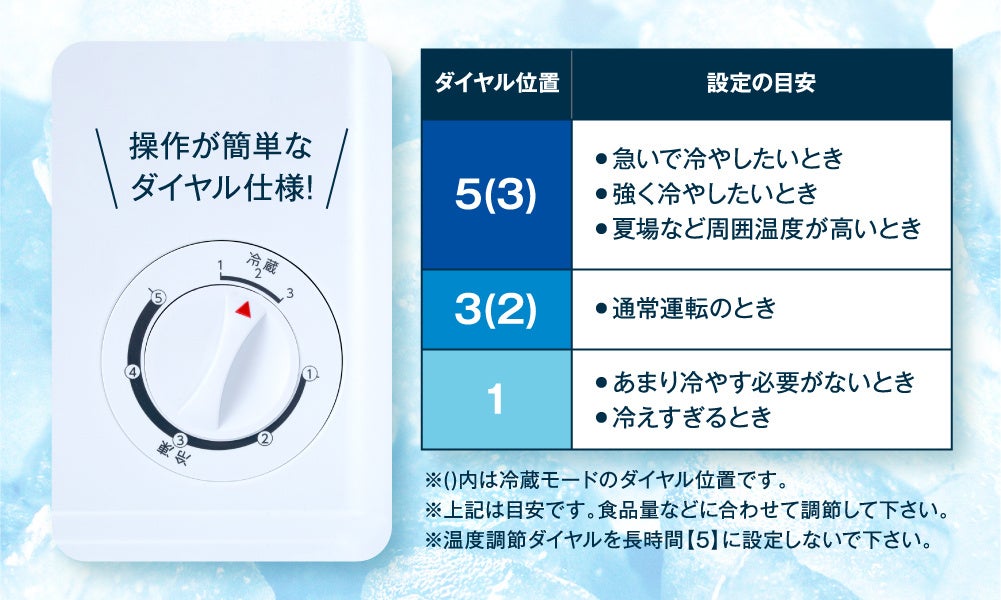 ダイヤルを回すだけで、庫内に入れる食材の量、種類などに合わせて冷凍/冷蔵を切り替えることができます。1台で冷凍庫と冷蔵庫の2役をこなすため、使い方の幅が広がります。