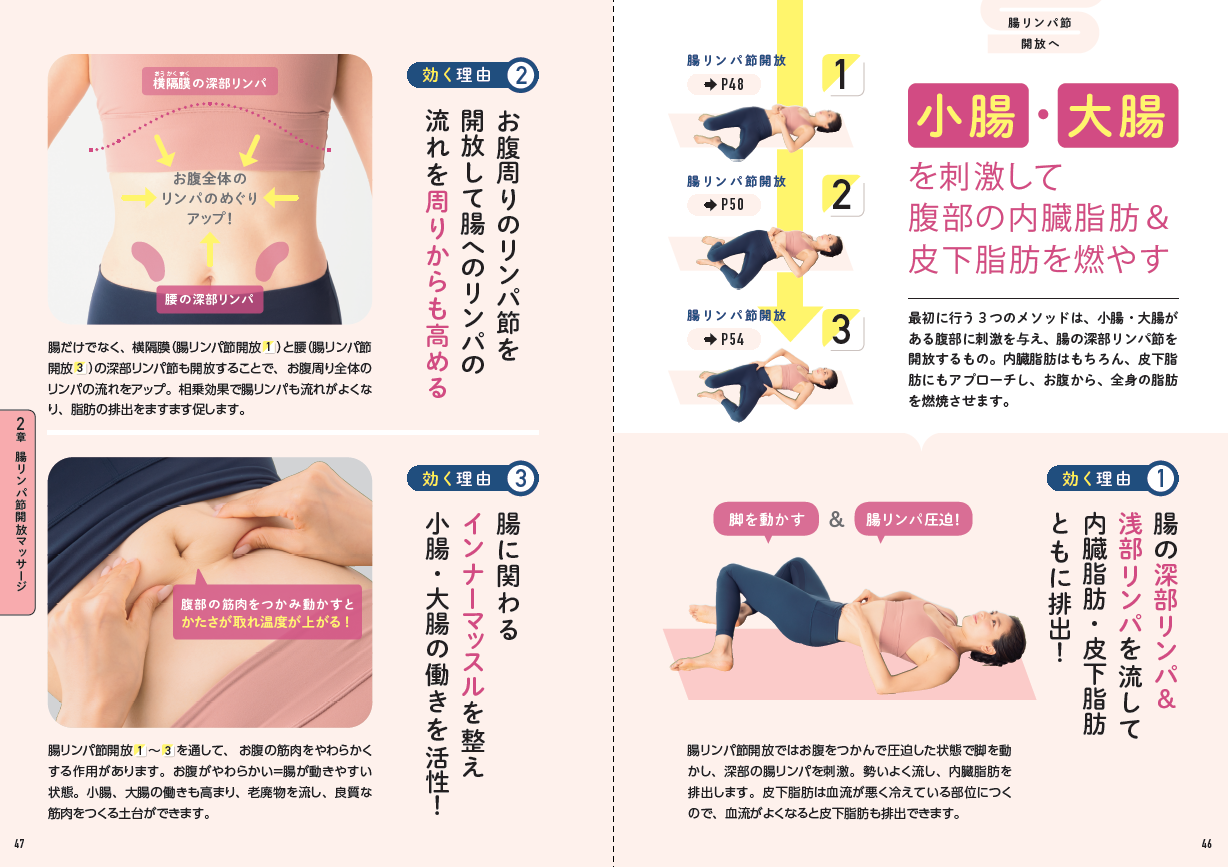 腸を活性化させることで、取り込んだ栄養をすばやくエネルギーに変えられるので代謝があがり、老廃物は便として排出しやすくなります。ただし食事での腸活は主に大腸のみにアプローチするもの。実は腸活には小腸がとても重要。腸リンパは小腸に多く集まっているのです。より腸の状態を改善し、ダイエットや不調改善効果を得たいなのなら、小腸と大腸両方にアプローチする本書の『深部リンパ節開放 腸活マッサージ』をぜひ取り入れてみてはいかがでしょうか。