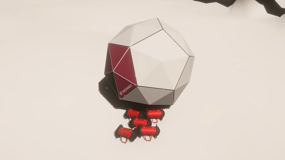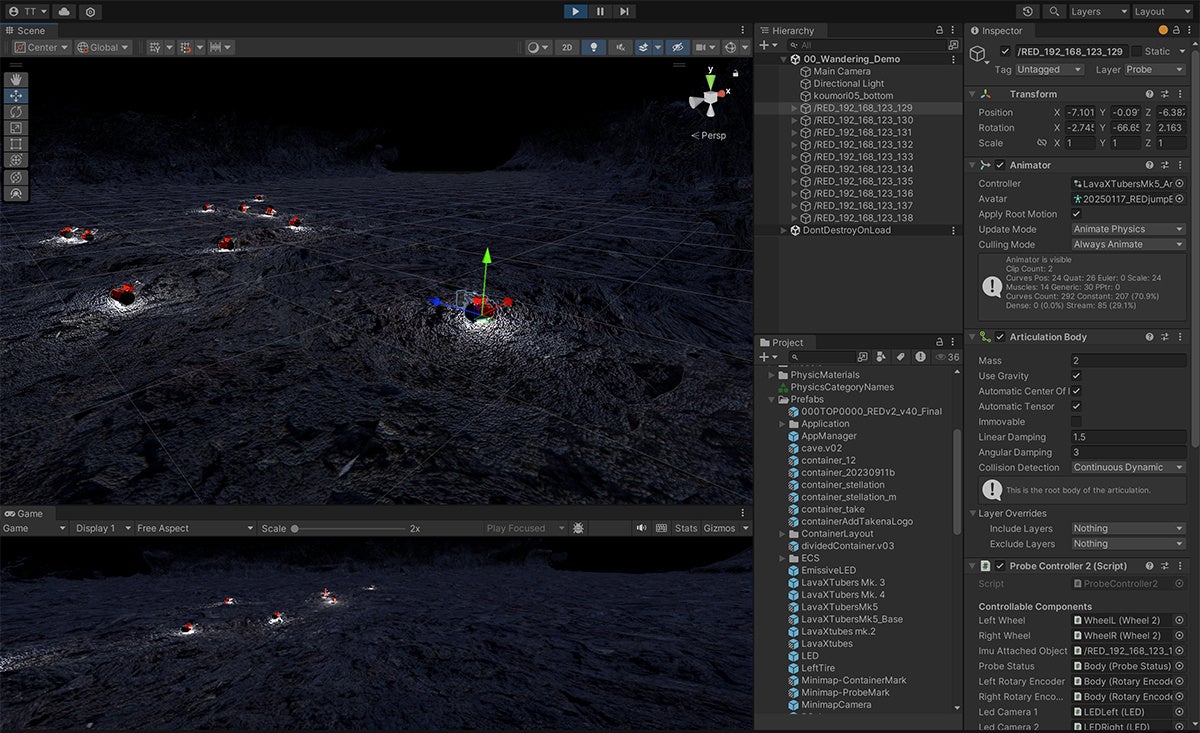仮想空間内に再現した月の溶岩チューブは、竹中工務店が富士山麓にある溶岩チューブをスキャンして得られた3次元地形データ(点群(※4)およびメッシュデータ(※5))を加工してUnityに組み込んでいます。小型ロボットおよびそれらの電⼒や通信を補う星型多面体のコンテナは、竹中工務店が設計したCADデータを3Dモデル化してUnityに取り込み、左右のタイヤの回転によって移動する動きやコンテナを押して回転させる動きを物理計算し、描画しています。