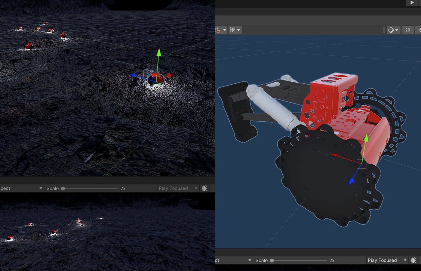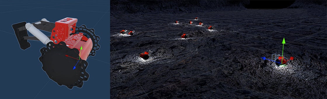 当社が竹中工務店からの委託により開発支援したシミュレーション環境は、ゲームエンジン(※1)「Unity(ユニティ)」による3Dデジタルツイン(※2)技術で構築した仮想空間です。AIを搭載した小型群ロボットによる月の溶岩チューブ内での探査と拠点建築の実現を目的として、シミュレーションで得られた情報をもとにロボットの研究を推進するために活用されています。