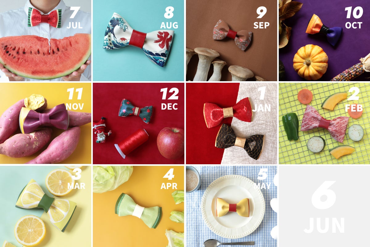 グルメレポーター彦摩呂さんプロデュースの「グルメな革の蝶ネクタイ」。毎月四季折々のグルメが蝶ネクタイとなって登場します。テレビの食レポで着けた姿が見れるかも?