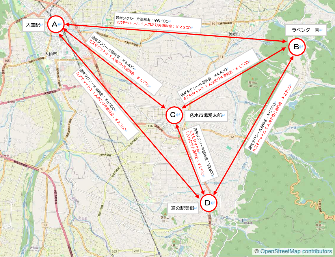 運賃 | ・JR大曲駅 ⇔ ラベンダー園 2,300円 ・JR大曲駅 ⇔ 名水市場湧太郎 1,700円 ・JR大曲駅 ⇔ 道の駅美郷 2,300円 ・ラベンダー園 ⇔ 名水市場湧太郎 1,700円 ・ラベンダー園 ⇔ 道の駅美郷 2,300円 ・名水市場湧太郎 ⇔ 道の駅美郷 1,100円 ※上記は大人1名当たりの運賃です。12歳未満は半額となります。 ※通常のタクシー料金より3割程度の運賃で移動することができます。 |