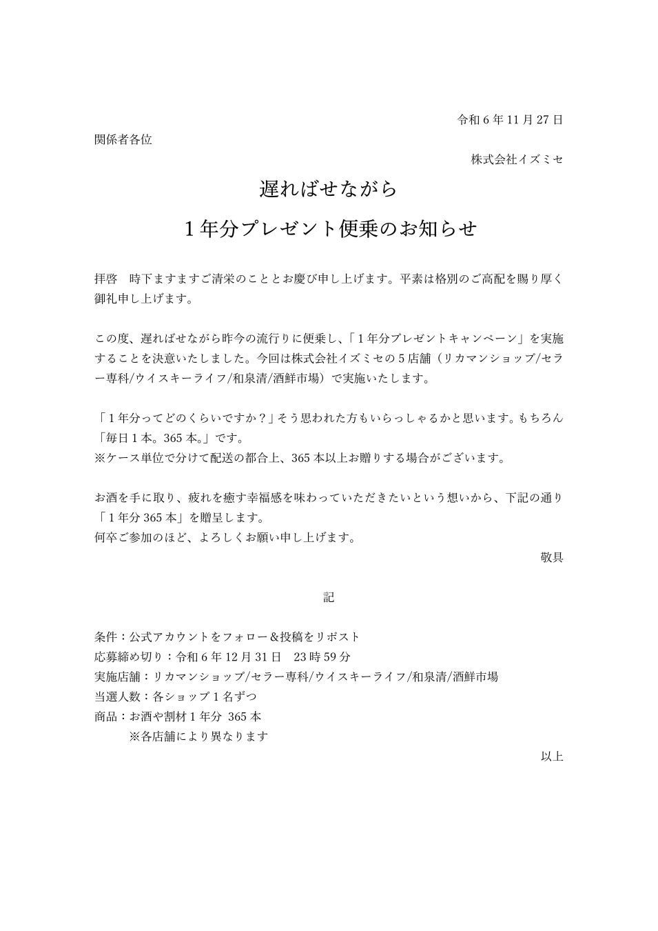 「お酒1年分プレゼント」遅ればせながら便乗します!株式会社イズミセが展開する5店舗でお酒や割材プレゼントのビックキャンペーンスタート!