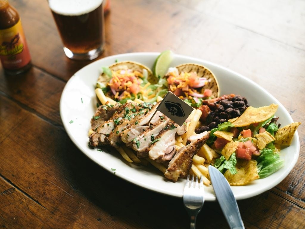 鉄板でジューシーに焼き上げたグリル肉は、そのままビールのお供としても最高。もちろん、トルティーヤに包んでタコス風に楽しむのもアリ。