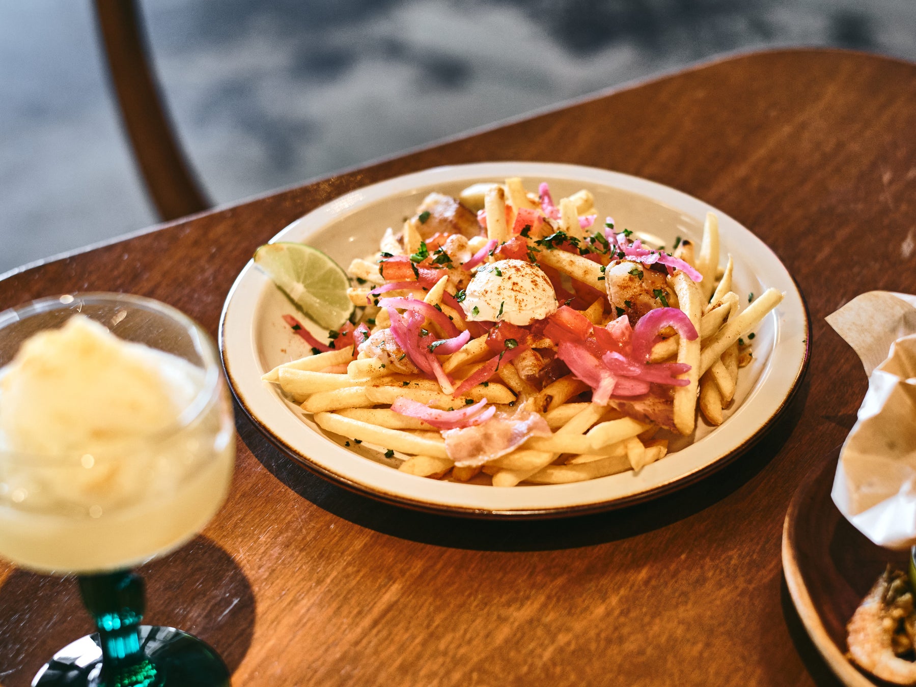クレイジーなボリュームの盛り付け!カリッと揚げたポテトにジューシーなベーコンをたっぷりトッピングし、爽やかな酸味が広がるサルサソースとピクルスを合わせ、香ばしさとフレッシュさのバランスが絶妙です。新しい味の組み合わせが生み出すインパクトに驚かされること間違いなし!見るだけで食欲をそそる一皿をぜひお楽しみください。