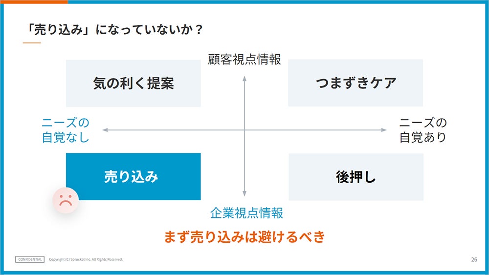 クーポンなどの施策は、企業視点の情報を一方的に伝える「売り込み」でしかありません。Sprocketは「企業視点か、顧客視点か」「顧客にニーズの自覚があるか、ないか」という2つの軸でCX(顧客体験)を設計しています。ライドオンエクスプレスの担当者はその中の「つまずきケア」や「気の利く提案」こそがオンラインでの本質的な接客であると感じ、Sprocketで施策に取り組むことを決めました。