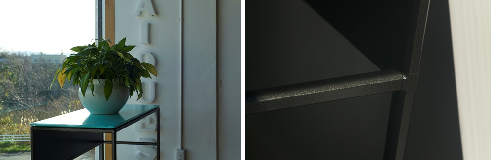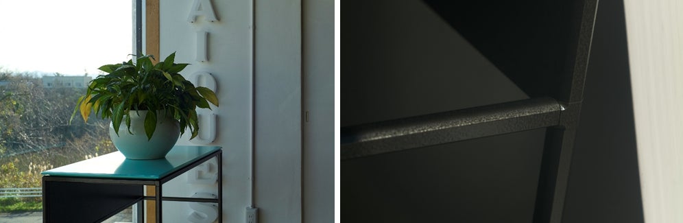 本デスクをかたちづくるのは、印象的な天板カラーと、強い存在感を放つフレーム仕上げという二つの要素。それぞれ異なる背景から導かれたディテールが重なり合い、この一台の佇まいを決定づけています。