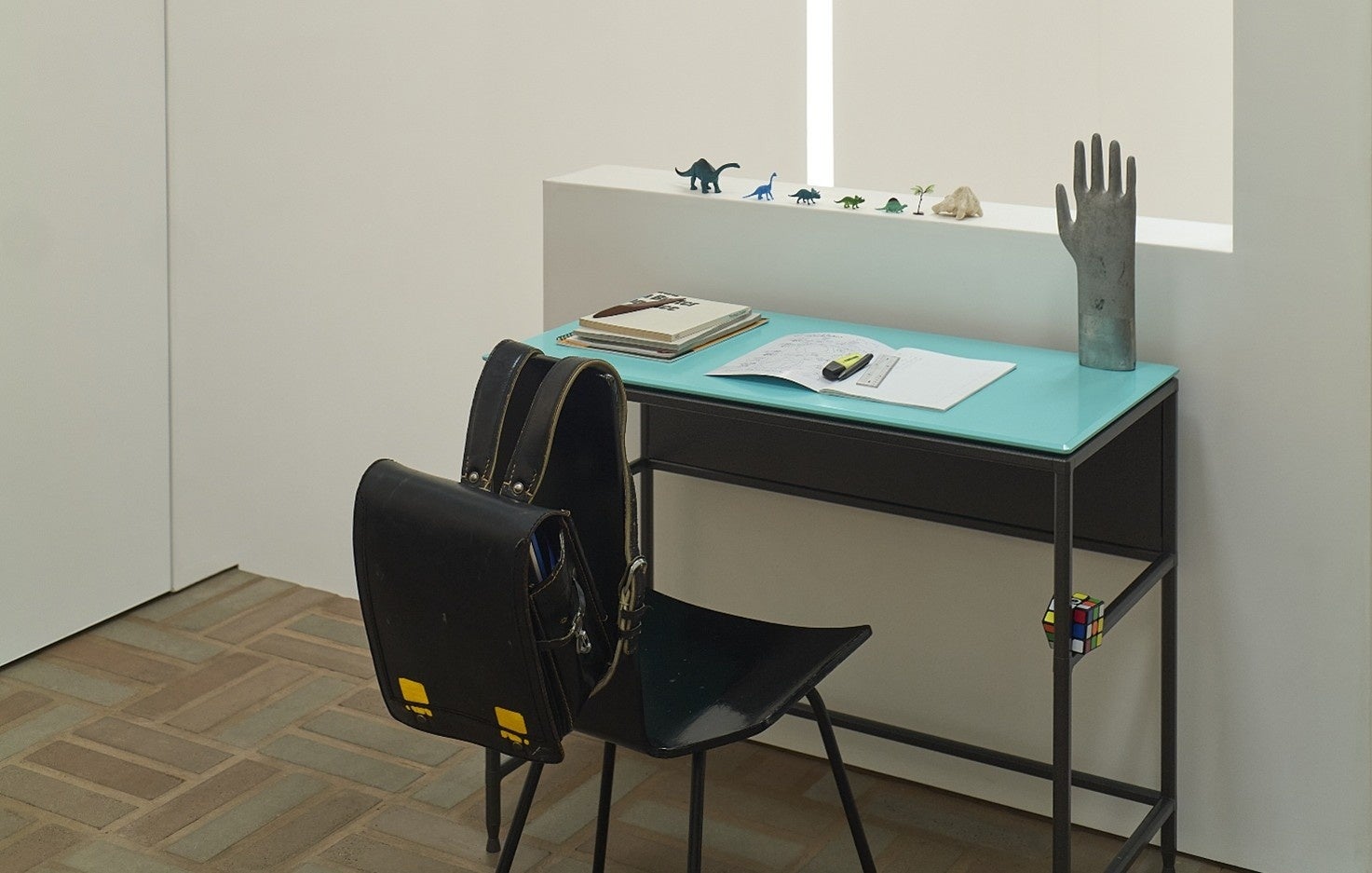 天板に採用したのは、鮮やかなミントグリーンカラー。この色は、石川県加賀市のセレクトショップ「PHAETON(フェートン)」のオーナーであり、定期刊行物『大勉強』の編集長である坂矢悠詞人氏の愛車のボディカラーから着想を得たものです。「大勉強するためのデスクならば」と坂矢氏が直観的に選んだこの色は、従来の勉強机のイメージとは対照的ながら、思考に明るさをもたらし、硬直しがちな空気をやわらかく解きほぐす、「学びの時間」に新たなリズムを与える色彩です。
