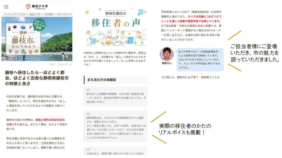 縁結び大学では、各市区町村の移住担当課の職員の方に直接話しを伺った情報を元にした「リアルな移住情報」を掲載しています。特に「移住後の暮らし」に重きをおき、移住先に希望する仕事や住居はあるのか、どのように生活が変わるのか、子どもたちが受けられる教育はどのようなものかといった暮らしに密接する情報を詳しく掲載することで、移住を検討する方たちが思い描く「理想の暮らし」がそこにあるのかをイメージできるようなコンテンツに仕上げています。