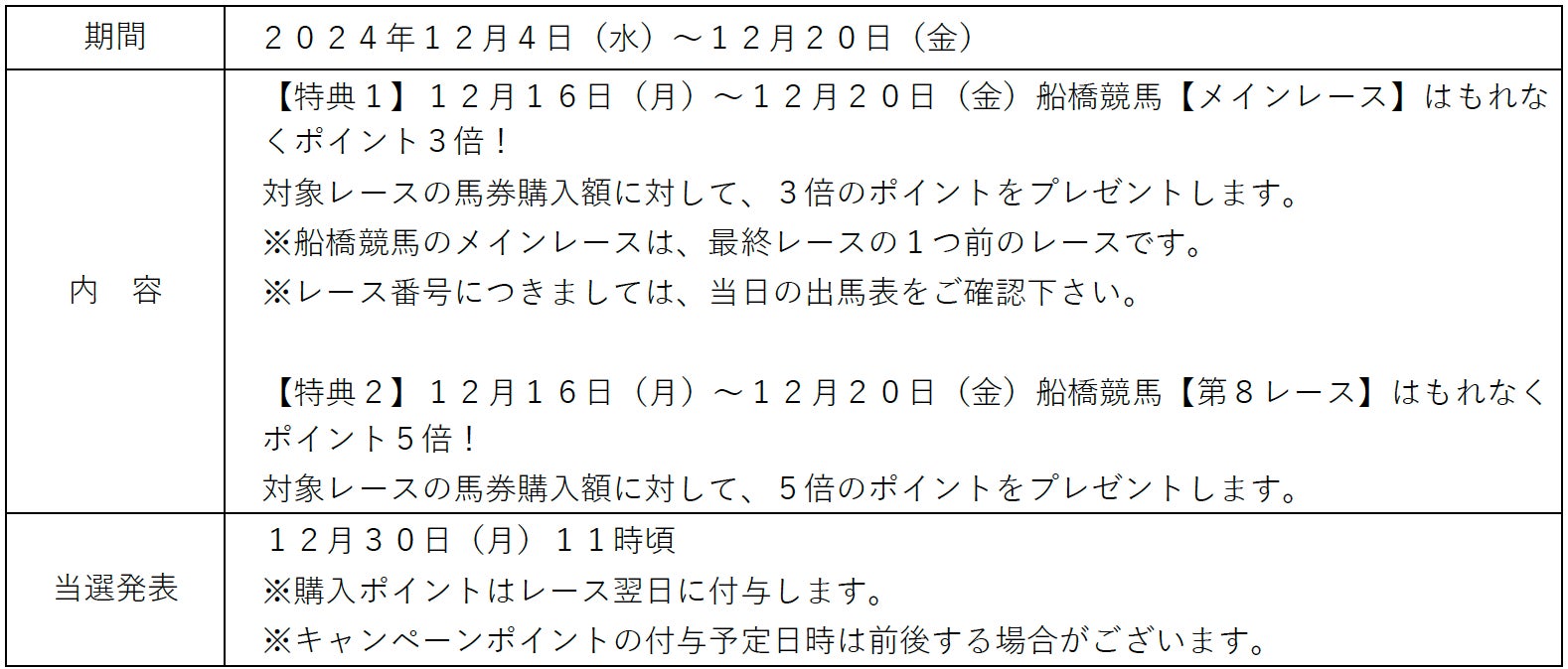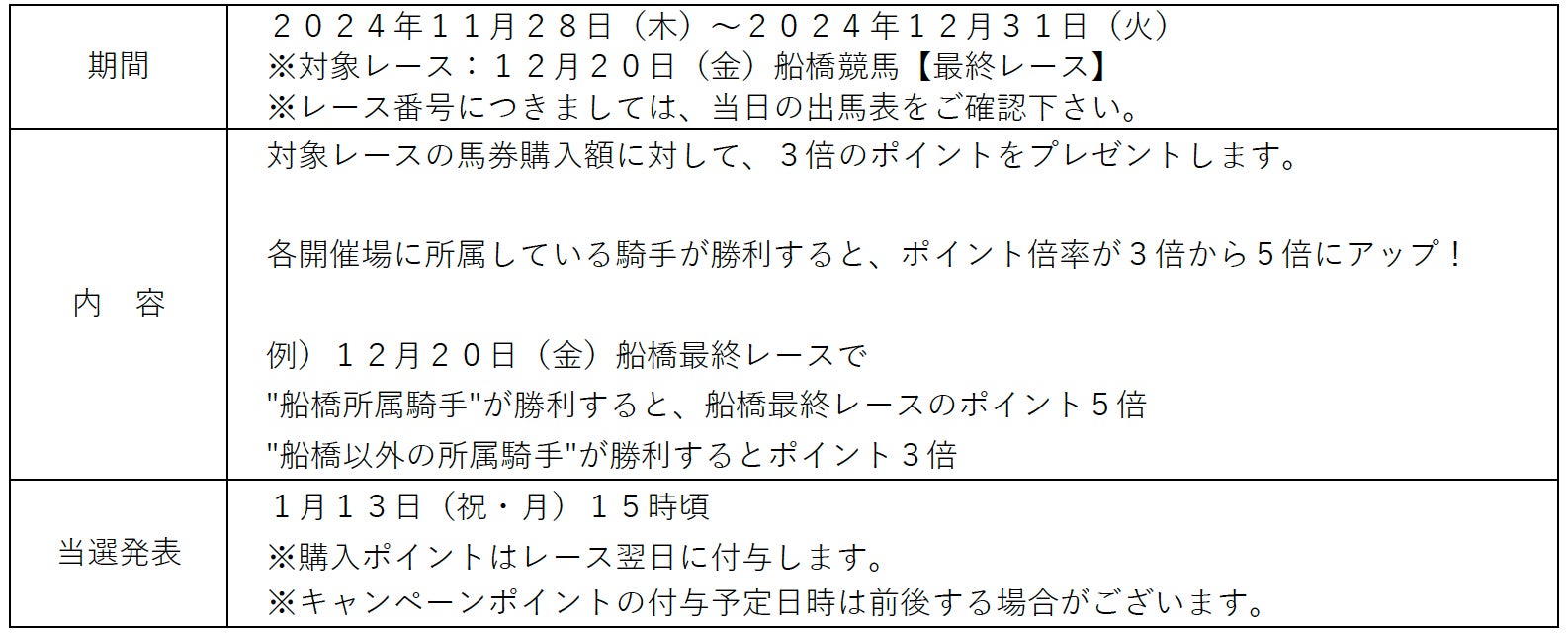 船橋ケイバでは、令和6年度第10回開催を12月16日(月)~12月20日(金)に開催いたします。第10回開催では、女性のお客様へ入浴剤をプレゼントする「レディースウェルカムデー」や、千葉の畜産物が当たる「畜産物抽選会」など多数のイベントを実施いたします。また、12月16日(月)に森泰斗騎手の引退セレモニーや森泰斗騎手引退記念グッズがあたる抽選会などもおこないます。2024年最後の船橋ケイバ開催もぜひお楽しみください!
