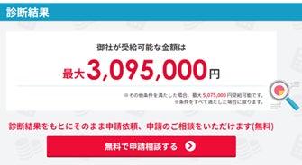 30問のチェックリストに「はい」か「いいえ」の二択で回答するだけで、その場で受給可能な助成金と受給可能金額を算定します。