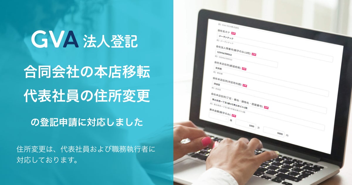 リーガルテックサービスの開発・運営を行うGVA TECH株式会社(本社:東京都渋谷区、代表取締役:山本 俊)は、オンライン商業登記支援サービス「GVA 法人登記」にて、新たに「合同会社の本店移転」「合同会社の代表社員および職務執行者の住所変更」に対応したことをお知らせいたします。