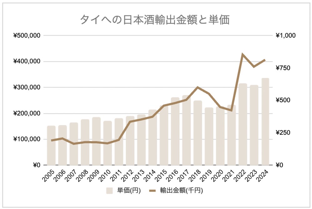 今回ペアリングディナーを開催したタイは、輸出金額・単価が増加傾向にあり、特にコロナ以降の3年間の伸びが顕著です。