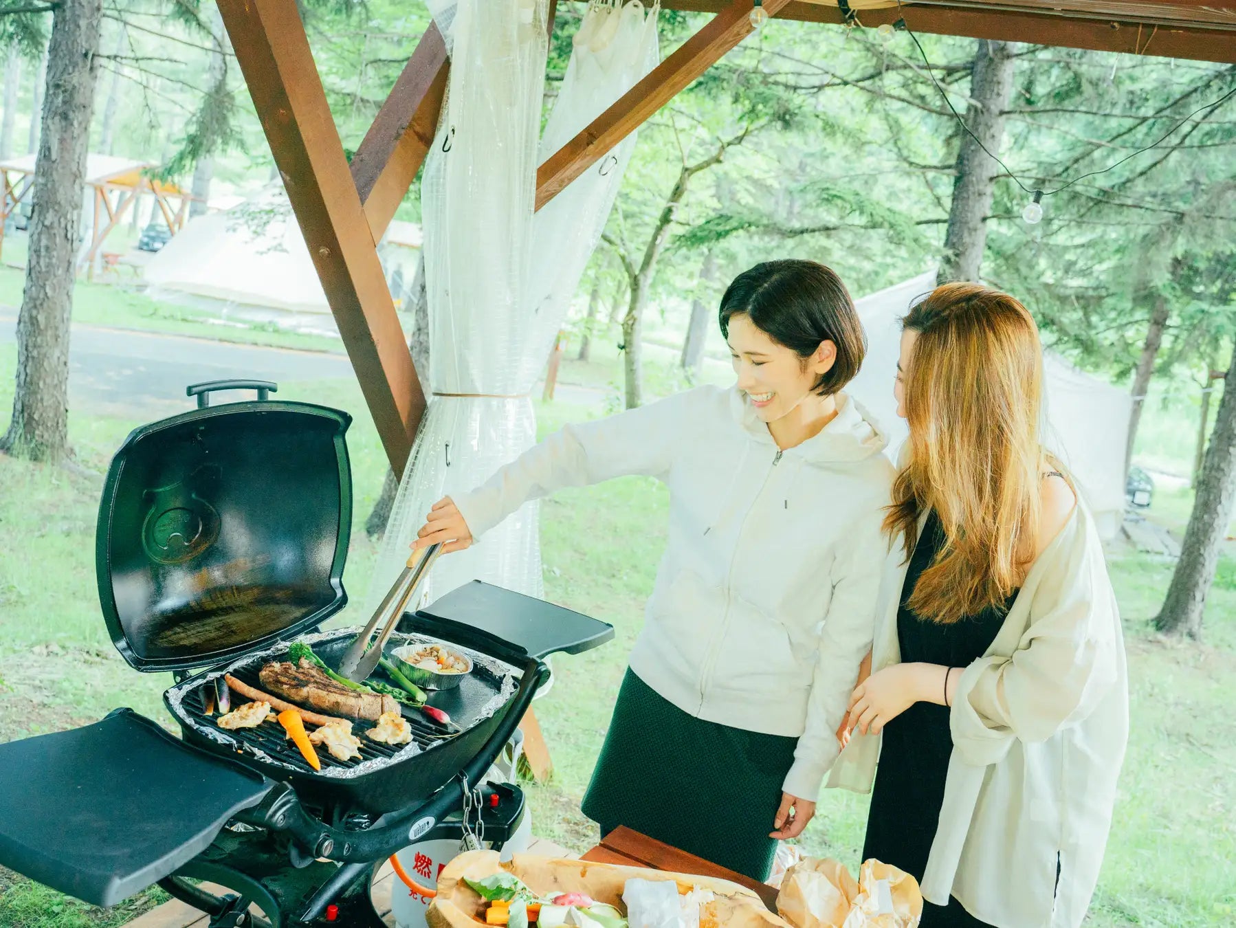 BBQはテント前の屋根のついたウッドデッキにて、BBQ本場アメリカweber社のガスグリルでお楽しみいただけます。着火や準備、片付けなどは全てスタッフで行いますので、はじめての方でも心配不要。調味料・お皿もすべて用意しているため、事前に食材や食器を持ってくる必要がないのもうれしいポイントです。