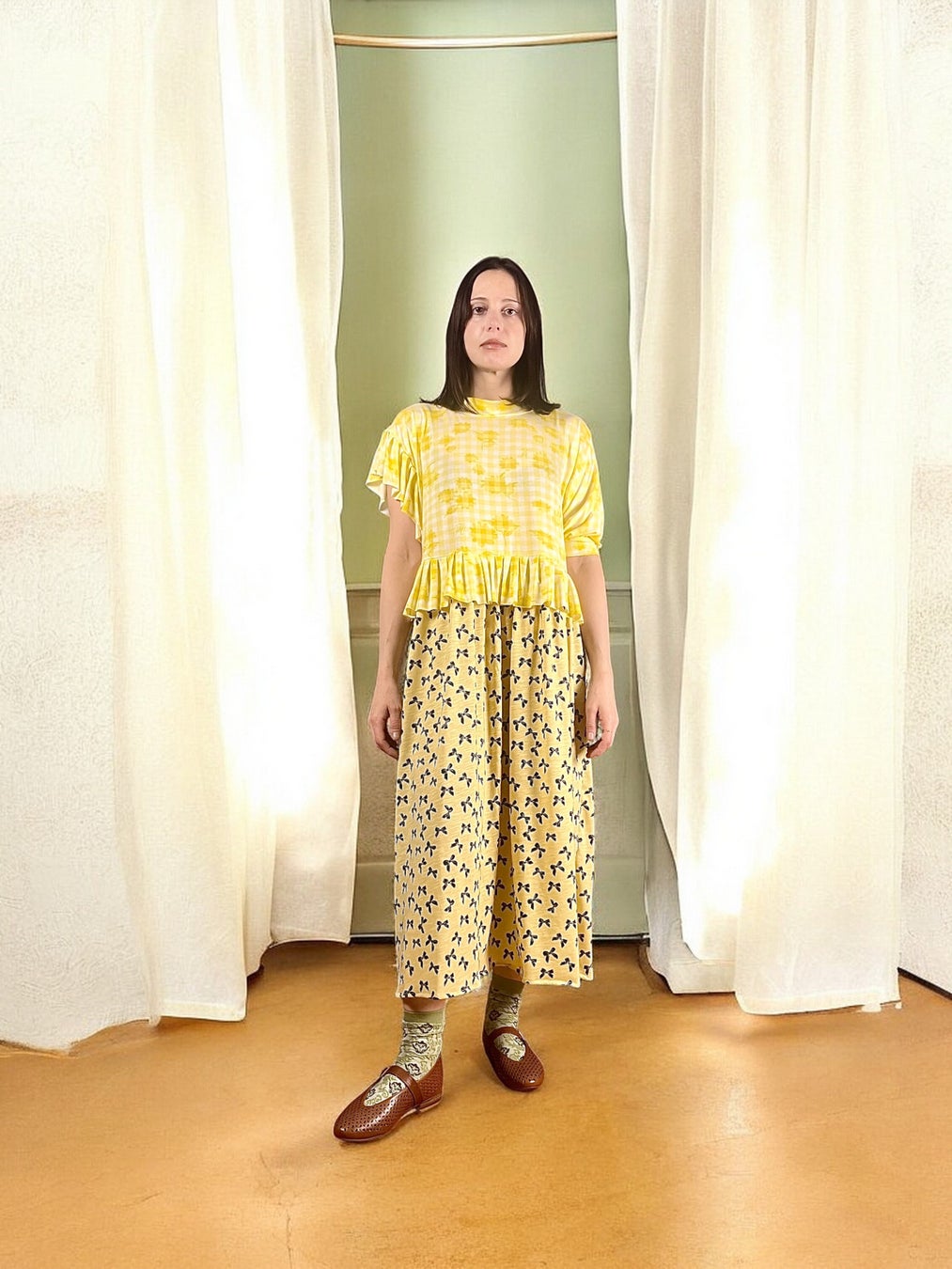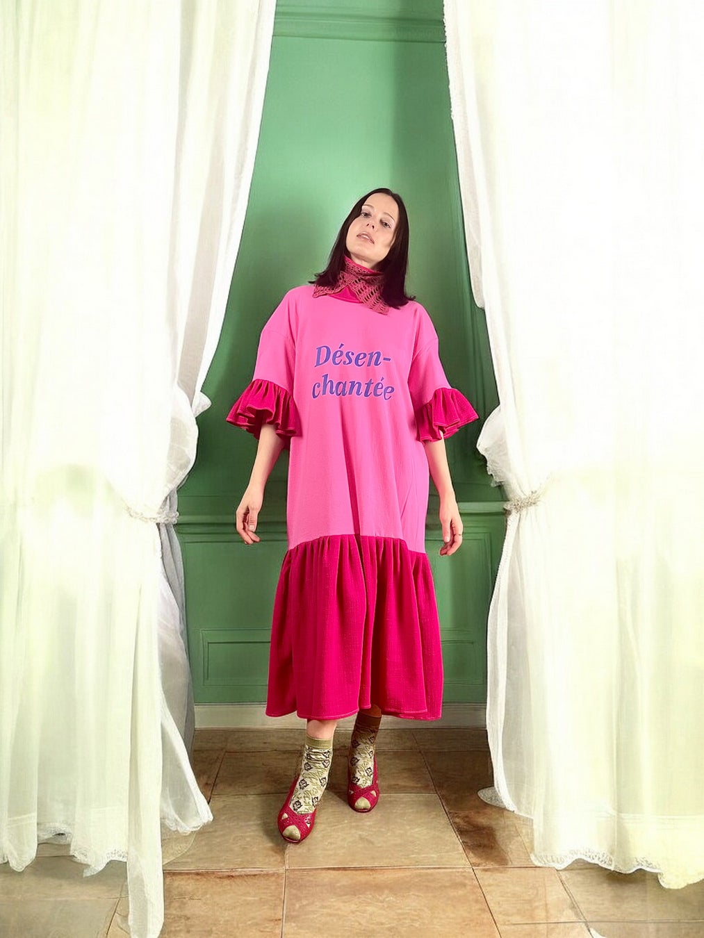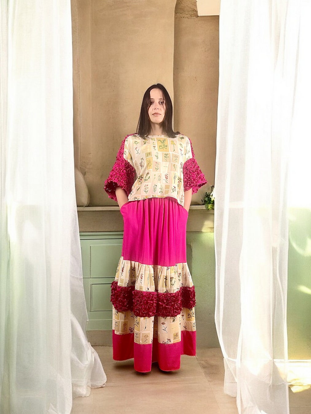 ベルリンのアトリエでは、デッドストック生地やアップサイクル素材を用い、一点一点手作業で制作。偶然性を含んだフォルムや色彩の重なりは、服そのものを“詩的なコラージュ”として成立させています。演劇性と実用性、ファンタジーと都市の日常が同居するクリエイションは、ファッションの既存の枠組みに収まらない新しい魅力として、世界各国で支持を集めています。
