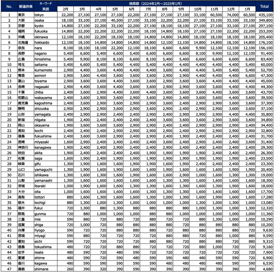 以下の表は、2024年2月~2025年1月のシンガポールにおける「日本の都道府県」の検索数をまとめたものです。検索数の上位を占めた1位東京、2位大阪、3位京都の大都市圏及び、4位福岡、5位沖縄、6位北海道、7位奈良については、これまでアウンコンサルティングが発表した米国編、香港編、オーストラリア編、および中国編の調査と同様の傾向であると考えられます。