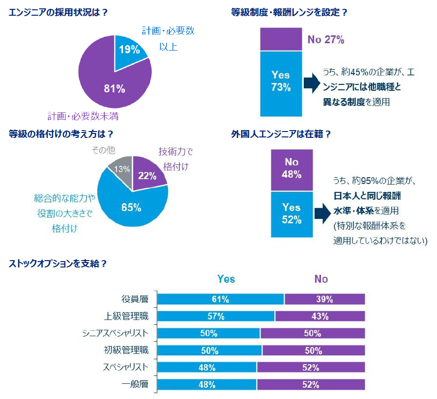 本調査には113社が参加した。調査の結果、多くのスタートアップ・ベンチャー企業で、エンジニアの採用・処遇に課題を感じる中、各社、エンジニア独自の報酬体系や、ストックオプションの活用、外国人エンジニアの採用等の工夫をしていることが分かった。また、エンジニアの報酬水準は、スペシャリストに比べてマネジメントの方が150~200万円ほど高いことも明らかになった。