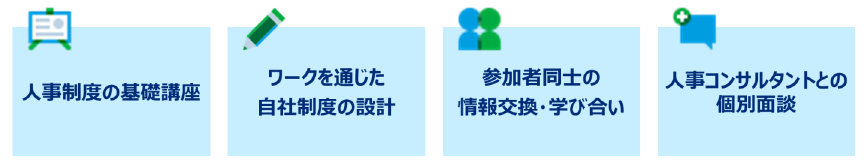 参加企業は、人事制度の基礎を学ぶ講座(全3回)と、実際に自社の制度を設計するワーク(全3回)への参加のほか、参加者同士の情報交換や、人事コンサルタントとの個別面談ができる。
