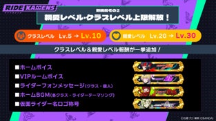 クラスレベル/親愛レベルの上限がそれぞれアップします。さらに上限解放に伴い、新たなボイスや称号、ライダーフォンメッセージ、そしてホームBGMとして使用できる各テーマソングなどが追加となります。