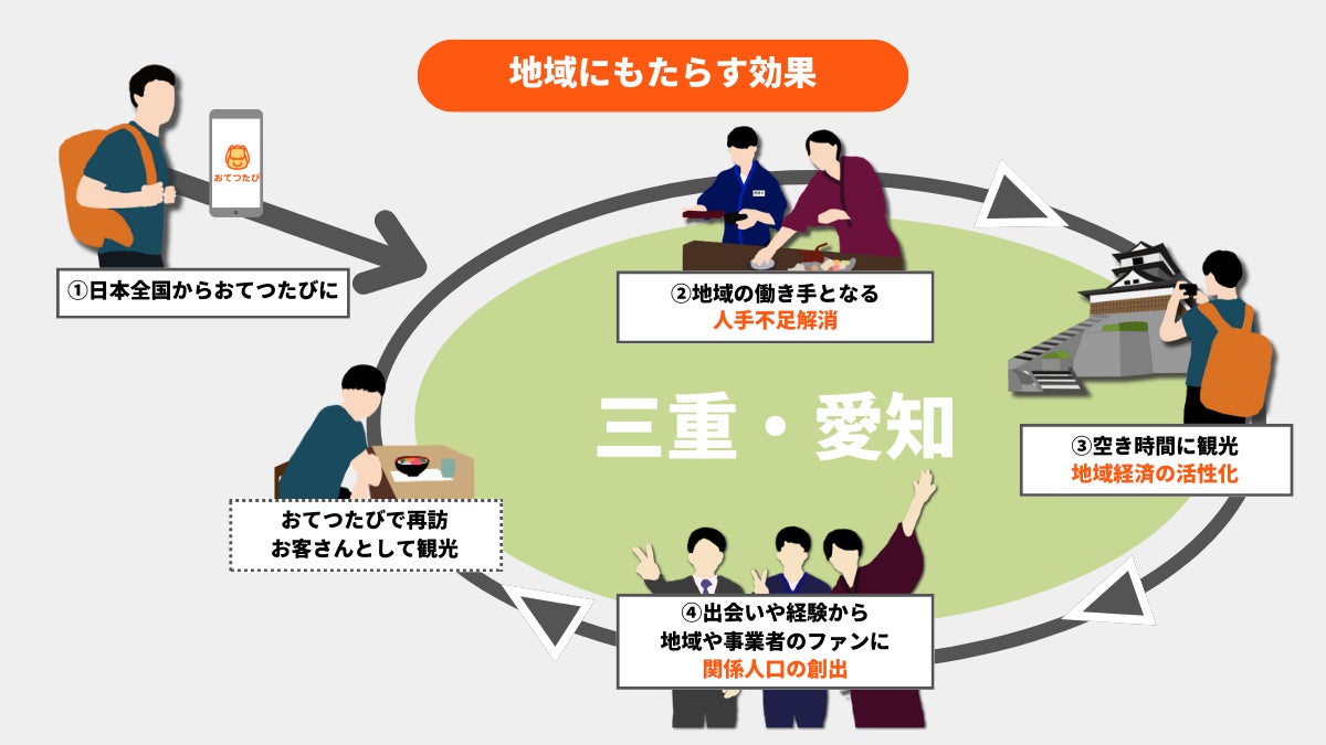 短期間かつ人手がほしい繁忙期に合わせたピンポイントの人材確保ができるほか、地域外からの就労者が三重・愛知地域のファン(関係人口)の創出や広告効果等が期待できます。
