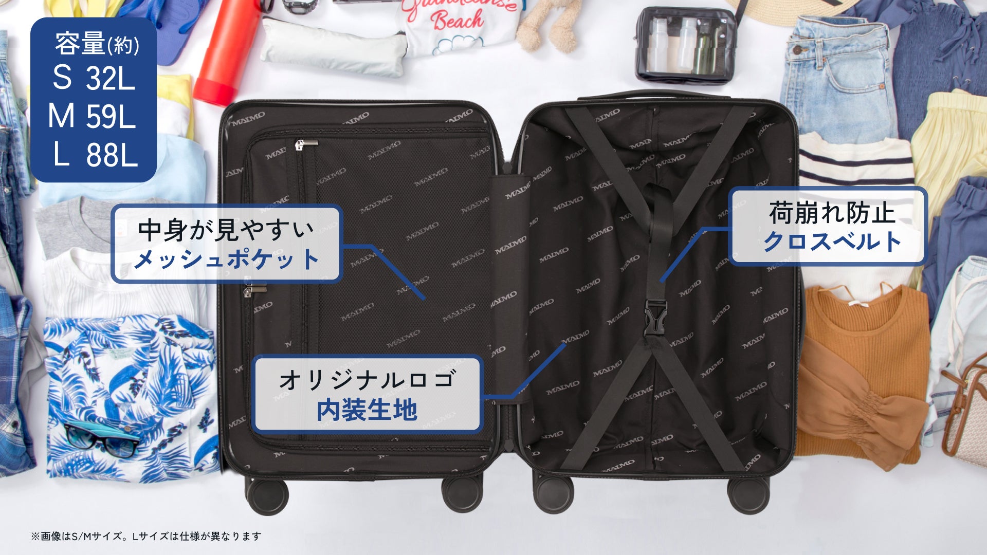 機内持ち込み対応のSサイズが約32L、Mサイズが約59L、Lサイズが約88Lの荷物が入る、大容量の収納スペース。整理整頓に便利な仕切り、ガイドブックやPCを収納するのに最適な大きめサイズのメッシュポケット、荷物崩れを防止するクロスベルト付き。※画像はS/Mサイズ。Lサイズは仕様が異なります。