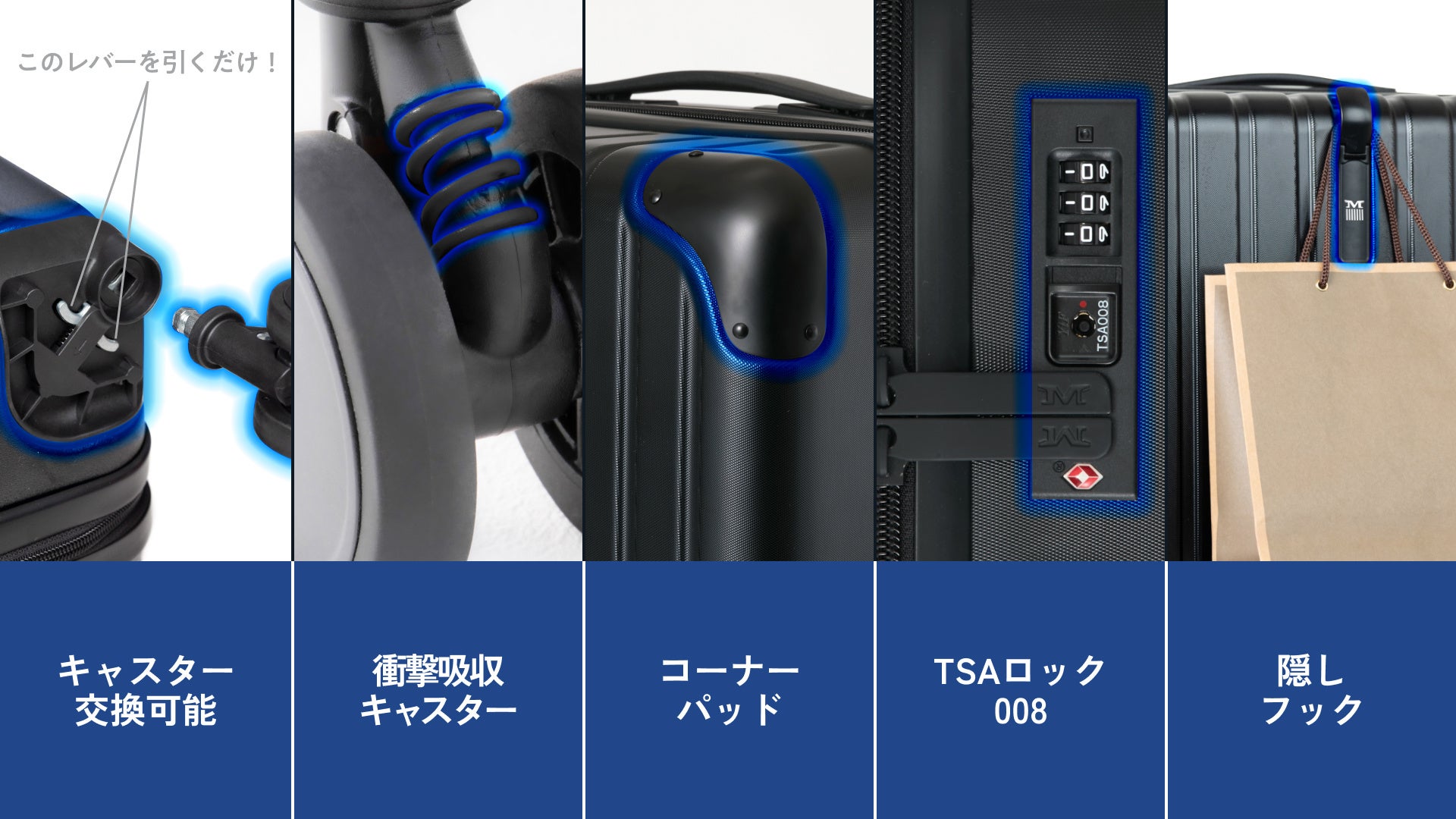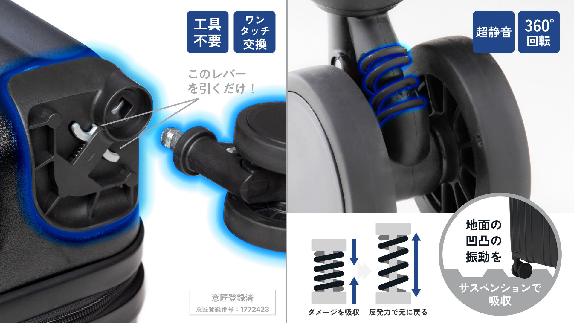 アルミ製コーナーパッドとサスペンション搭載したキャスターで、本体も足元も丈夫で長持ち。https://maimo-travel.com/products/protes