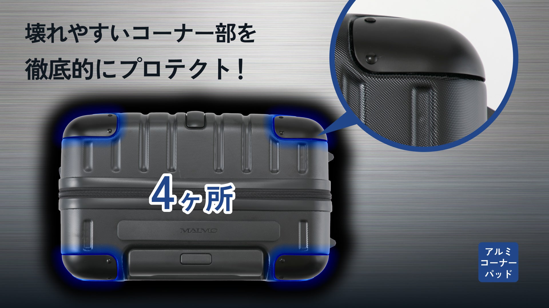 壊れやすいコーナー部にアルミ製コーナーパッドを4箇所装着しました。従来の樹脂製コーナーパッドと比べて、強度がより高くなり、衝撃から大切な荷物をしっかり守ります。